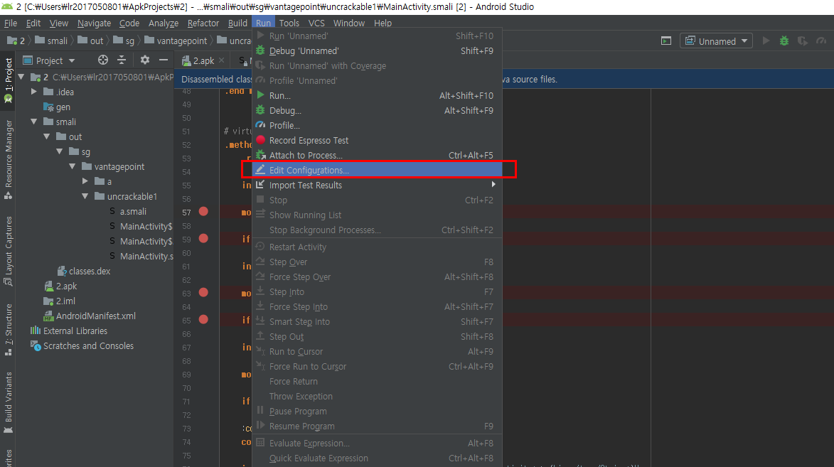 이후 뜨는 탐색창에서 분석하고자하는 APK파일을 선택하면 자동으로 디컴파일이 되면서 Smali 코드가 뜬다.