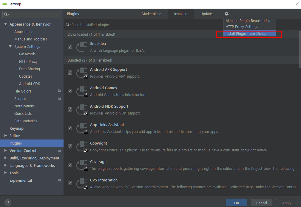 Android Studio 에서 File - Setup - Plugins - (톱니)Install Plugin from Disk... 를 선택하고 다운로드 받은 smalidea-0.05.zip 파일을 압축을 해제하지 않은상태로 선택한다.