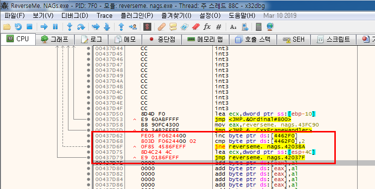 나는 0x4462F0의 주소를 변수 삼아 3번 분기문에 도달하는 시점에서 1씩 증가시킬 생각이다. 그리고 해당 주소의 값이 0 또는 2이면 분기문을 수행한 지점으로 JMP, 1이면 분기문을 수행하지 않은 지점으로 JMP하는 코드를 작성할 생각이다.