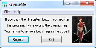 우선 프로그램을 실행시키면 "I'm the starting nag Remove me" 라는 Nag창이 뜨고, 일정시간이 흐르면 메인화면처럼 보이는 창이 뜨게된다. 이 때 Register 버튼을 눌러도 아무런 반응이 없는 것을 확인할 수 있다.