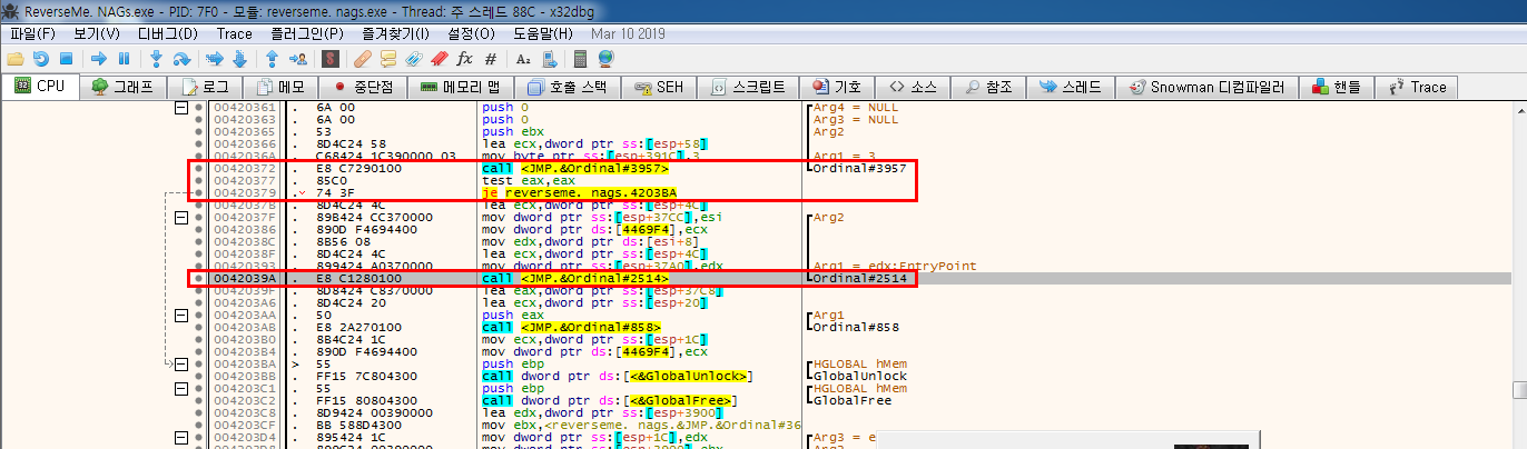 이렇게하면 Main화면이 띄워지는 두 번째 실행중에는 0x4203BA로 분기하고 Nag가 띄워지는 첫 번째, 세 번째 실행중에는 0x42037F로 분기하며 우리가 원하는 결과를 만들어낼 수 있다.