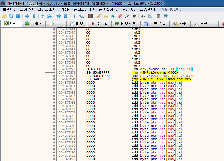 .text 섹션의 마지막 NULL Pading부분에 위와같이 코드를 작성했다. 여기서 의아한 부분이 있을텐데 0x437D75주소의 명령문은 왜 존재하는 것인지 잘 모를 수 있다. 이유는 아래와 같다.