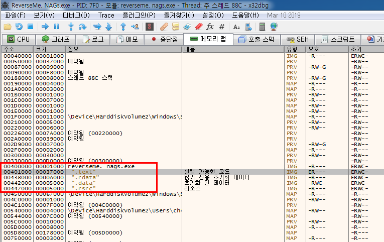 위 사진에서 메모리 맵 태그를 통해 해당 프로그램의 각 섹션 주소(Offset)과 Size를 확인할 수 있다.