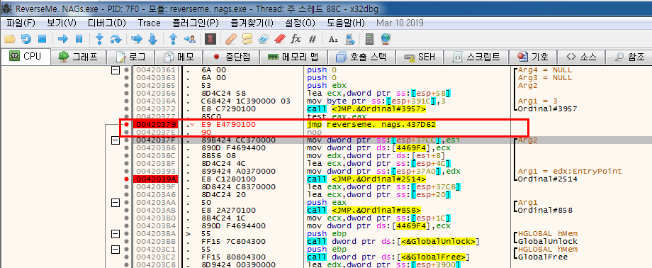 0x42039A 주소에서 함수를 호출하니 mfc쪽으로 넘어가서 해당 Nag창이 띄워지는 것을 확인할 수 있다. 코드를 살펴보던 중 조금 위에 0x420379를통해 해당 함수 호출을 분기문을 통해 건너띌 수 있음을 확인할 수 있다.