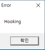 위 코드에서 13~15번 라인에 해당되는 내용이며, 기존에 출력해려던 문자열 대신 "Hooking" 이라는 문자열을 메세지 박스에 출력하게 하는 코드이다. ( 응용은 엄청나게 다양하게 가능할 것으로 예상된다... )
