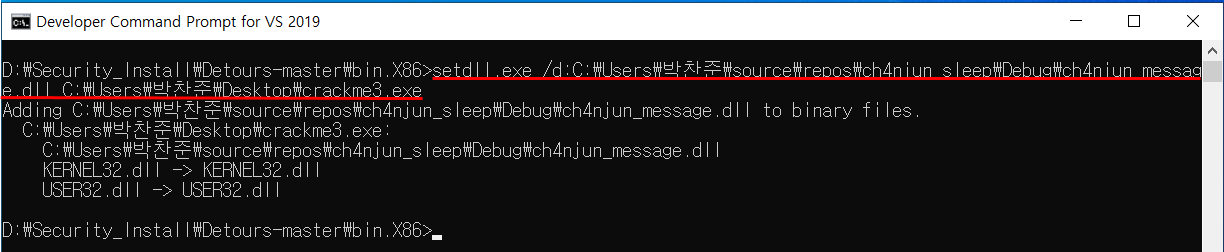 후킹 명령어는 setdll.exe /d:[DLL] [Target EXE] 을 통해 해당 EXE에 원하는 DLL을 주입할 수 있다.