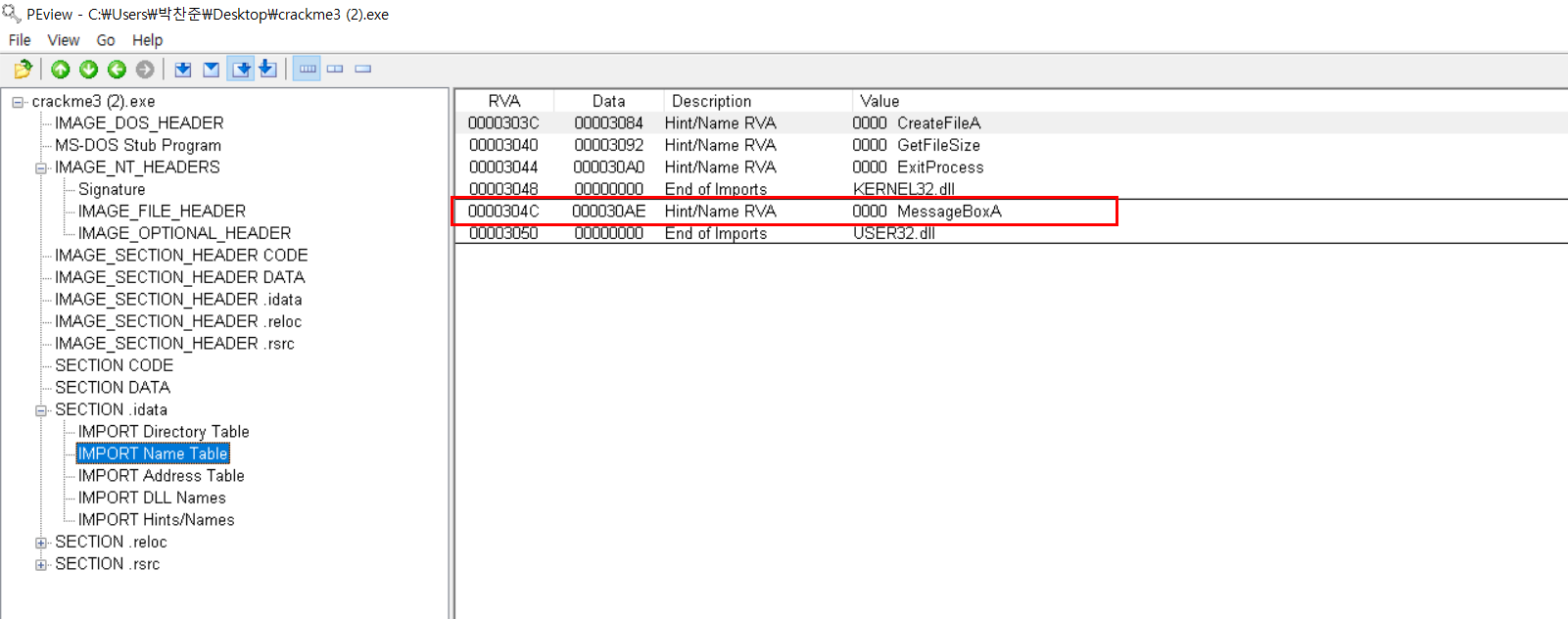 PEView로 확인해본 결과 USER32.dll의 MessageBoxA API가 사용되고 있는 것을 확인할 수 있었다.