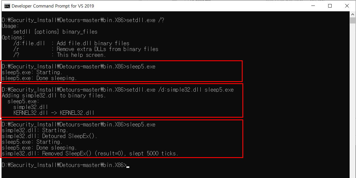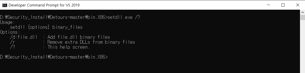 setdll.exe 파일을 이용해 샘플을 돌려보며 적응해보자. 잘 모를땐 항상 /? 옵션을 사용해서 도움말을 참고하도록 하자. 대부분의 샘플 명령어에는 기본적으로 해당 옵션이 존재한다.