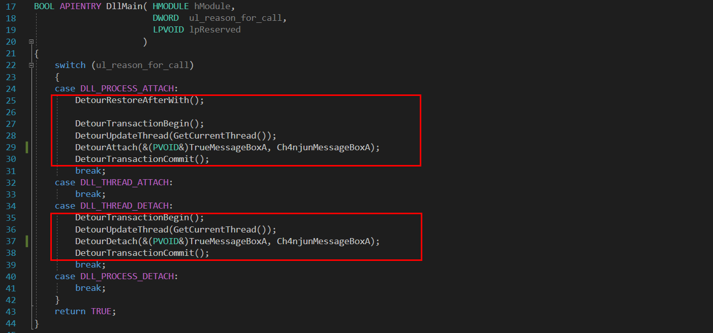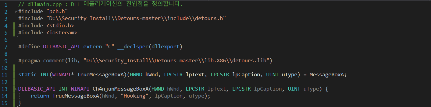 1) 3번 라인에서 detours.h를 반드시 include 해줘야한다.