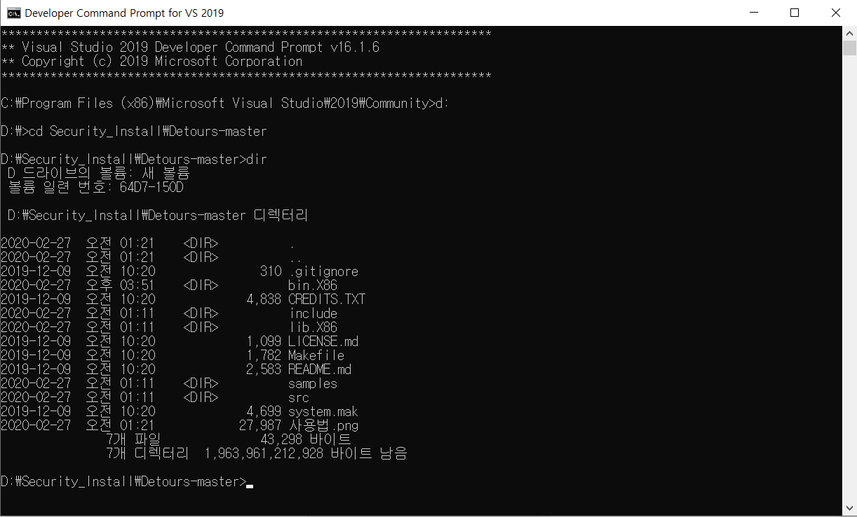 해당 프로젝트를 다운로드 받은 경로로 이동한 뒤 nmake 명령어를 통해 MakeFile를 실행해 빌드를 진행하도록 한다.