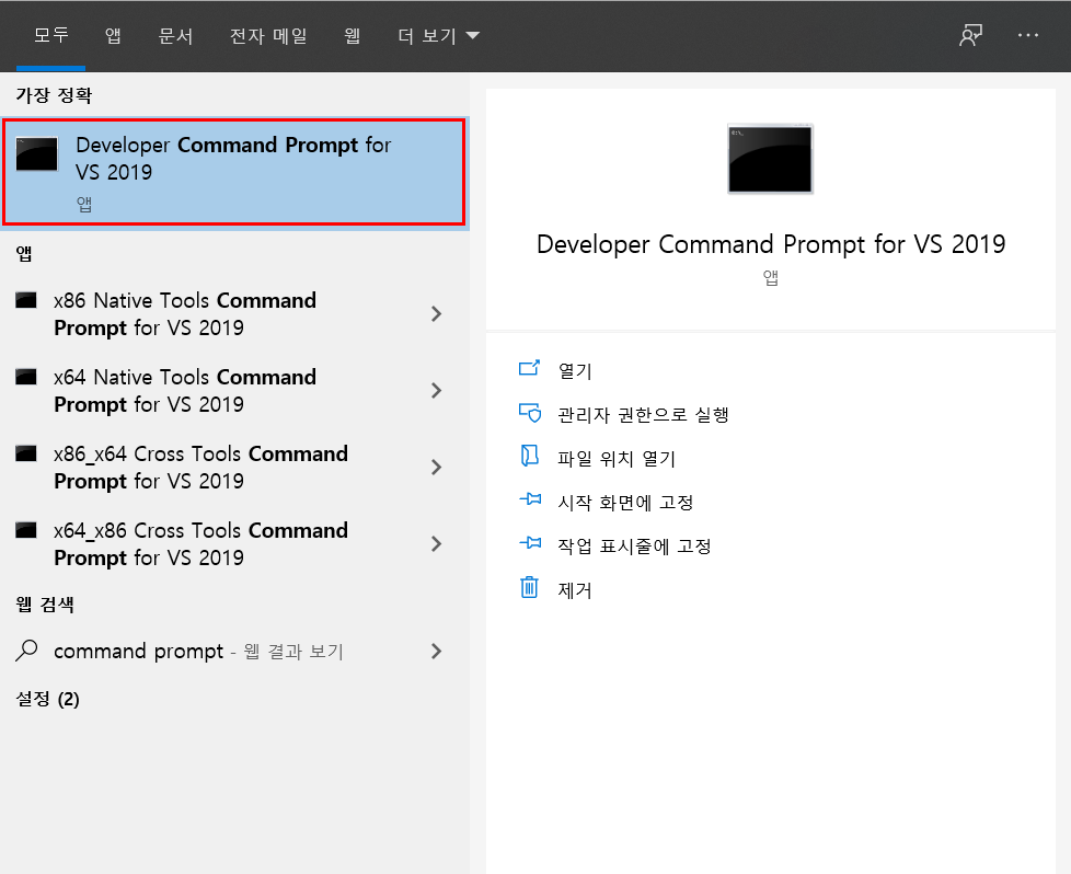 Github를 통해 다운로드를 받은 후 "Command Prompt"를 입력해 Visual Studio 터미널창으로 진입한다. 이와 같은 항목이 없을 경우에는 Visual Studio를 설치한 후에 진행하면 된다.