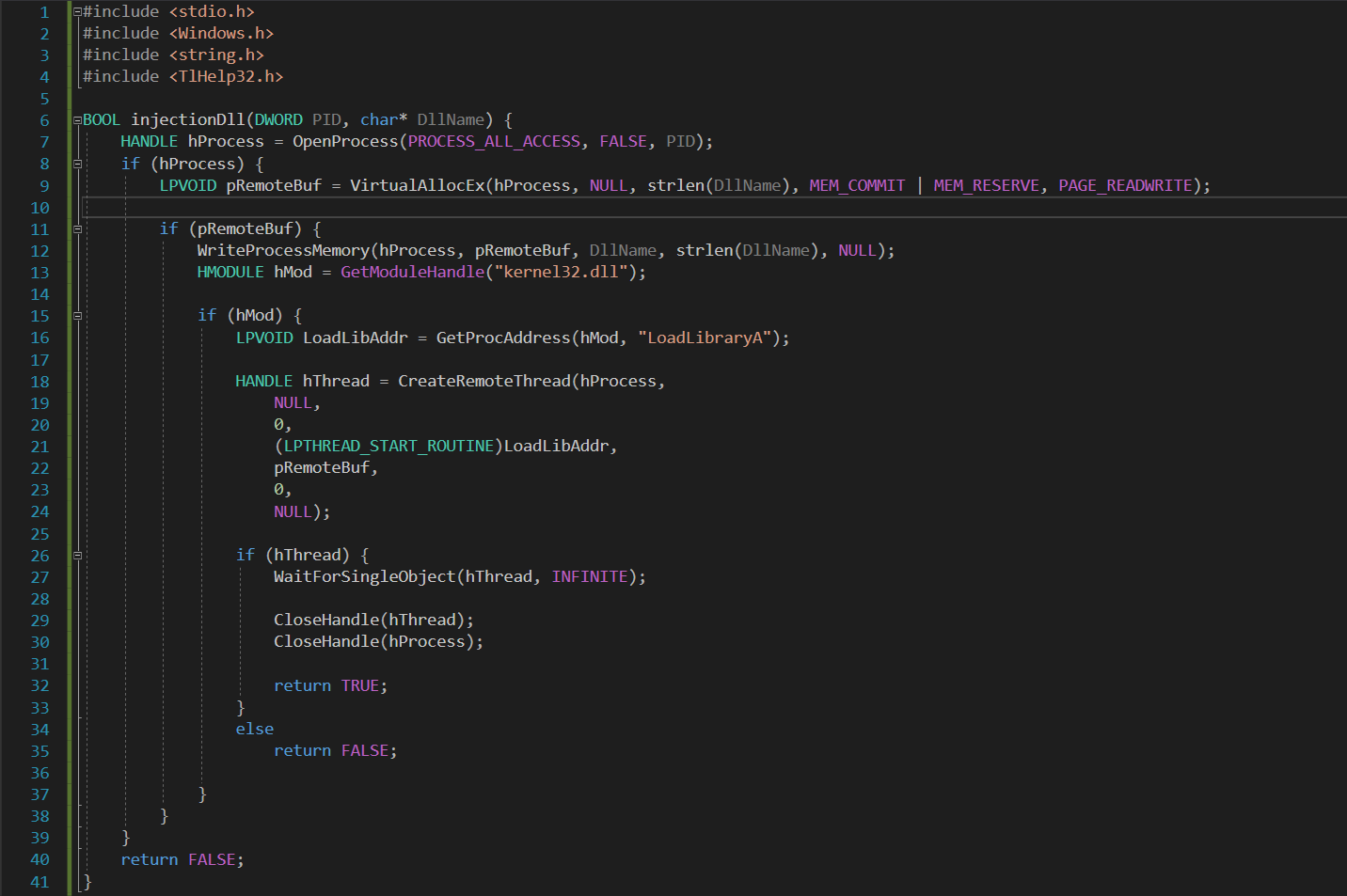 그러나 주의해야 할 점은 실행되지 않은 Process에 Hooking할 때와 달리 26번 라인의 DisableThreadLibraryCalls API를 반드시 호출해 주어야 한다. 이거 때문에 오지게 삽질함..ㅠ
