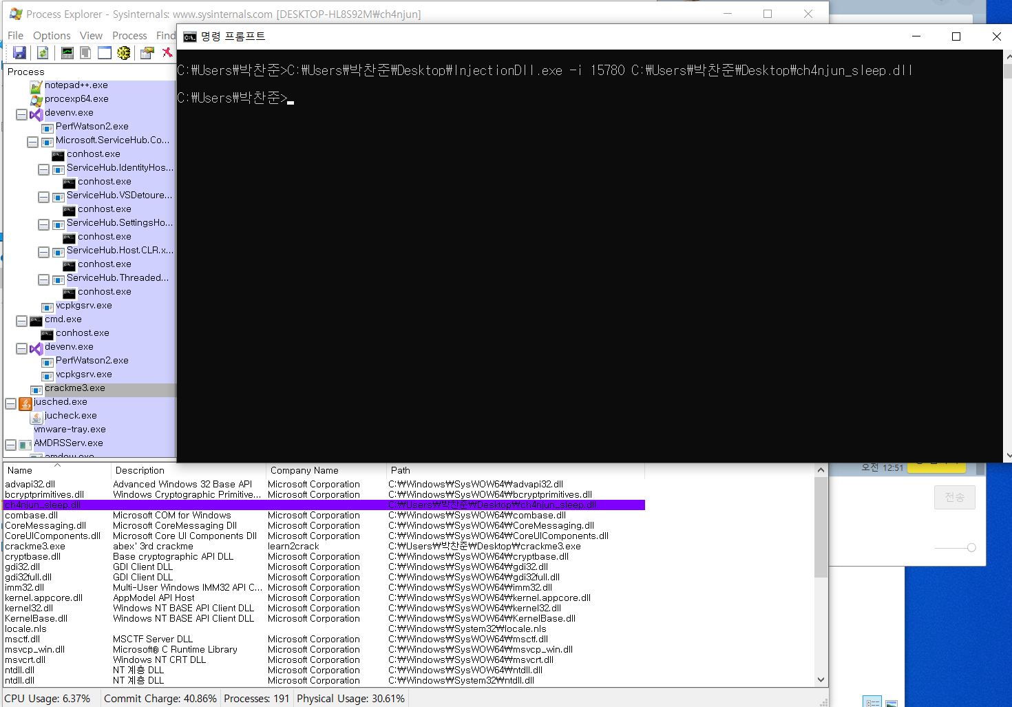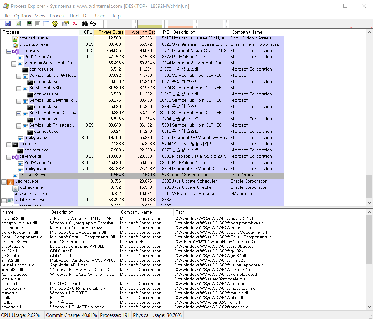 현재 Load된 DLL목록을 주욱 한번 살펴본 뒤 위에서 작성한 DLL Injection 코드를 실행해보자. 여기서 crackme3.exe의 PID를 확인한 후 DLL Injection 코드를 실행할 때 인자로 전달해 주어야 한다.