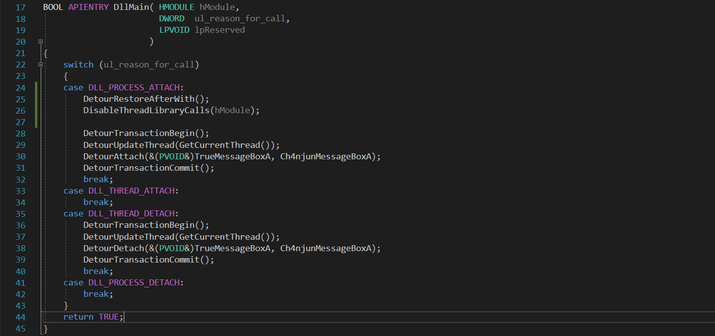 해당 DLL파일은 이전 포스팅에서 사용했던 코드와 완전히 동일하며, Detours Library를 사용해 MessageBoxA API의 API Hooking을 진행하는 코드이다.