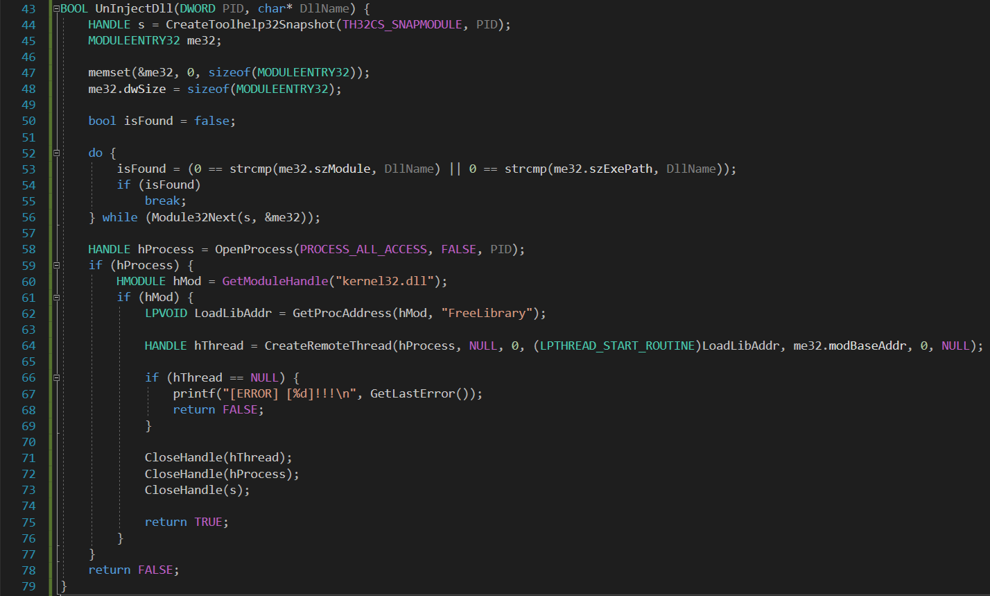 해당 Process에서 DLL Injection을 해제하는 코드는 아래와 같다.