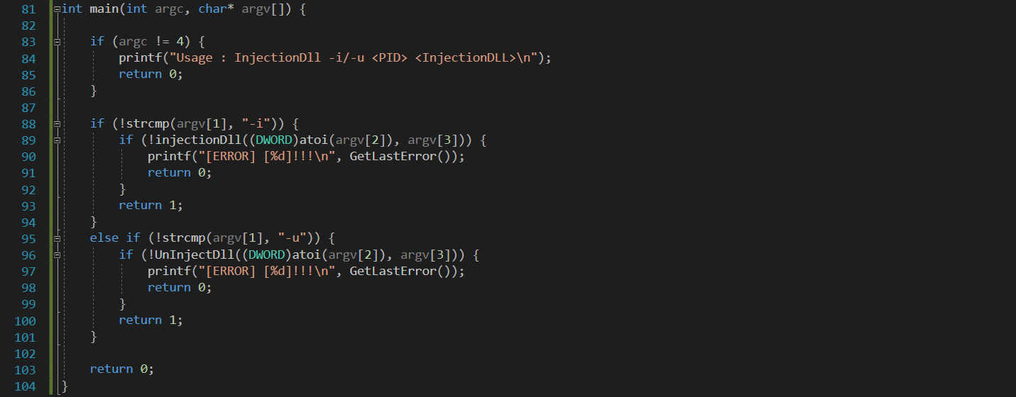 main 함수에서는 간단하게 사용법에 따른 Injection/UnInjection만 구분해줬다.