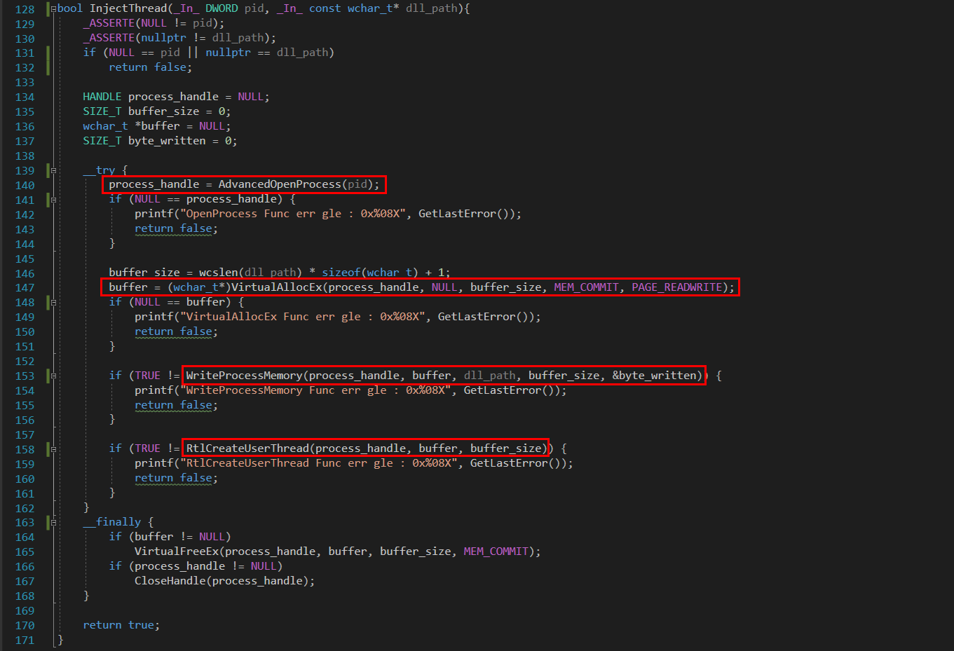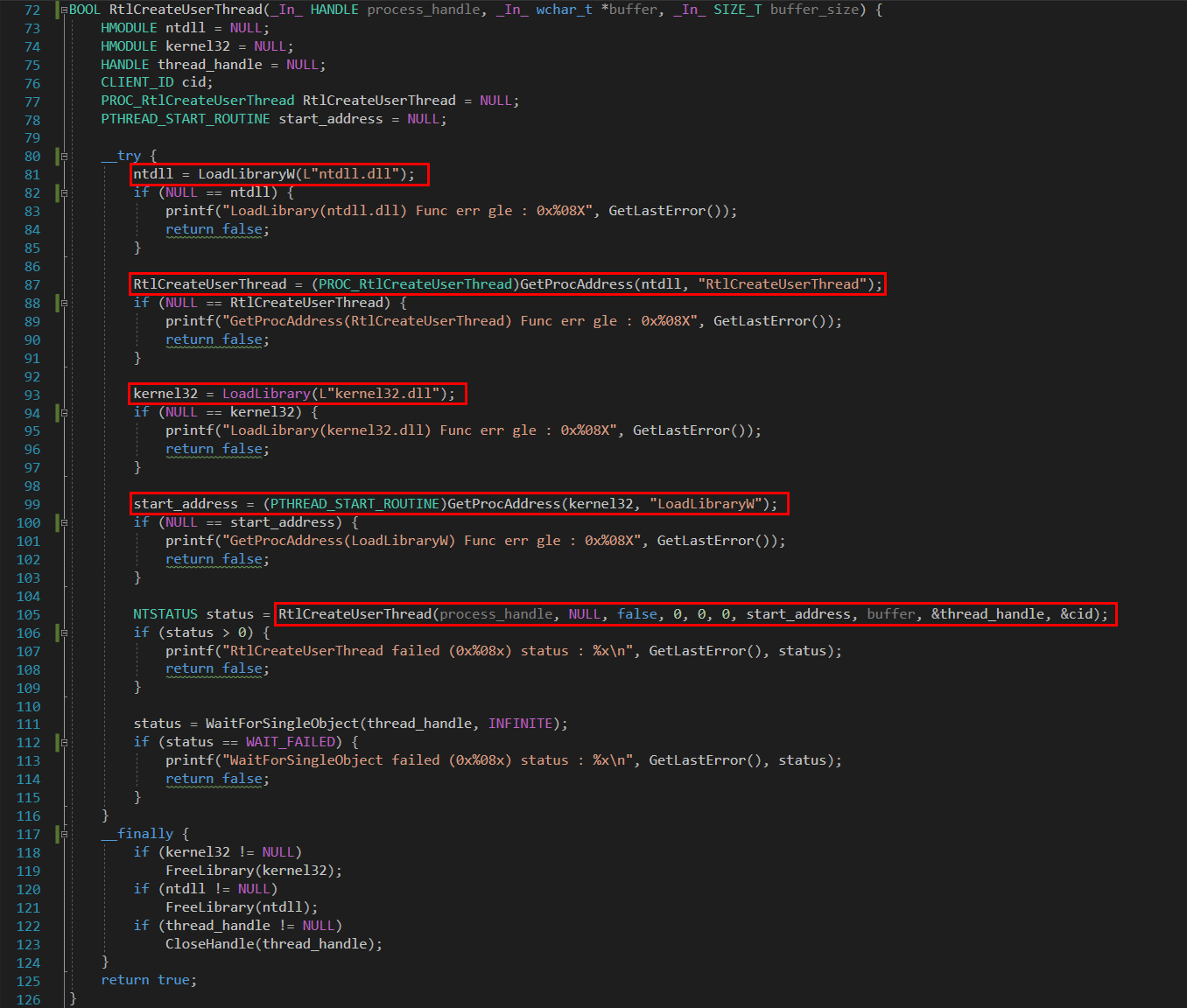 이후에 VirtualAllocEx API와 WriteProcessMemory API는 기존과 동일하게 진행되고, 기존에 사용하던 CreateRemoteThread API 대신 내가 구현한 RtlCreateUserThread 함수를 호출한다. 이 함수는 원래 존재하는 API이며 내부에서 그 API를 호출한다.