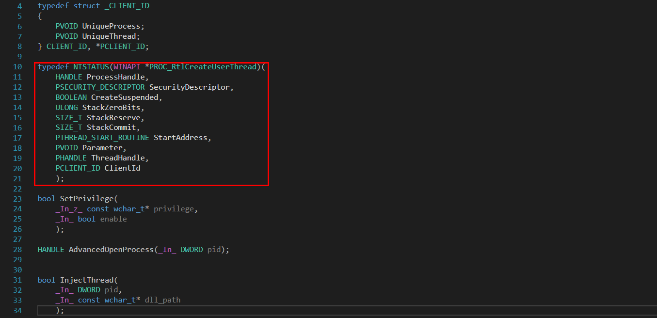 이 내용은 헤더파일에 작성되는 내용이며 RtlCreateUserThread API에 대한 typedef를 반드시 작성해야 한다. 그렇게 해야 LoadLibraryW API를 통해 RtlCreateUserThread API의 주소를 불러왔을 때 형변환 과정을 거친 후에 정상적으로 사용할 수 있다.