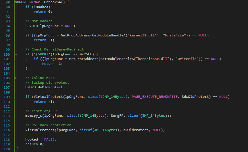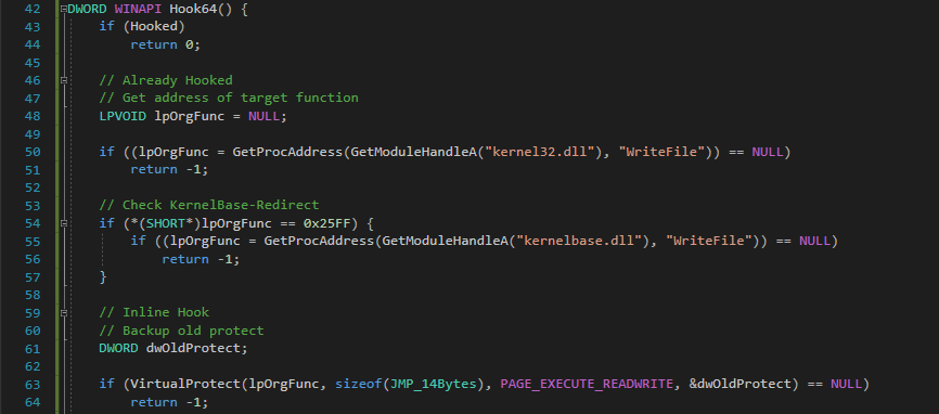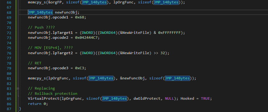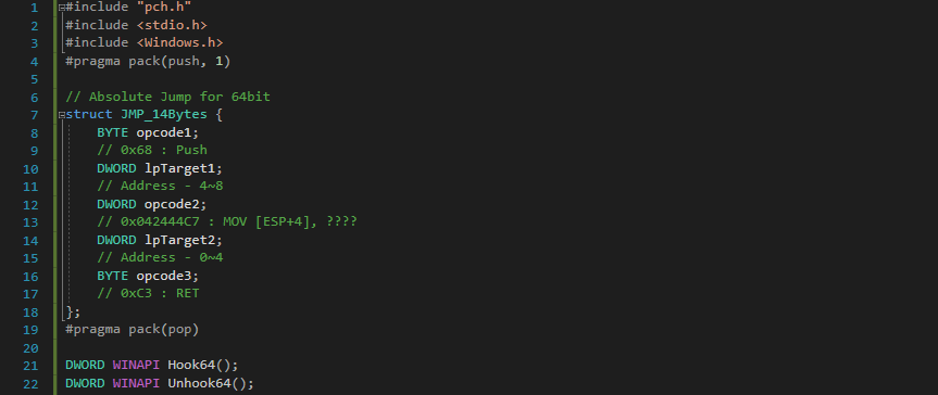 MASM으로 구현할 때에는 Target API 의 앞부분을 항상 검사해보고 명령어가 깨지지 않는 Byte수를 확인한 후에 진행해야한다. 그러나 C언어로 구현할 때에는 어차피 Hooking Function이 호출될 때 UnHook을 진행하고 하기 때문에 이런 걱정을 할 필요없이 그냥 14Byte Overwrite로 진행할 수 있다.