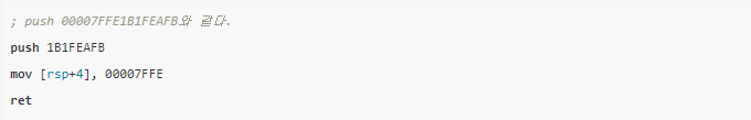 또한 push 명령어는 64bit 주소를 사용할 수 없어서 아래와 같은 방법을 이용한다.