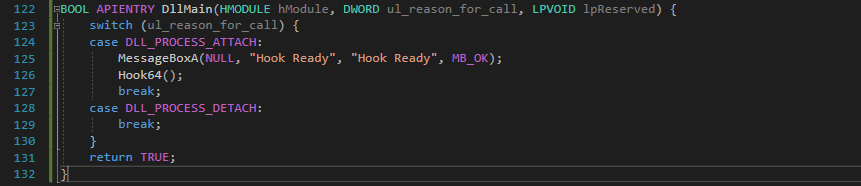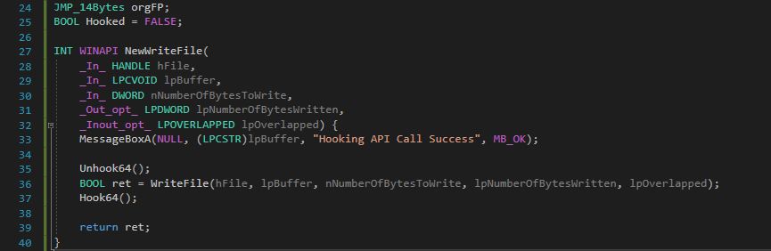 Target API 호출시 해당 API 호출전에 먼저 호출할 Hooking Function을 구현한 코드이다.