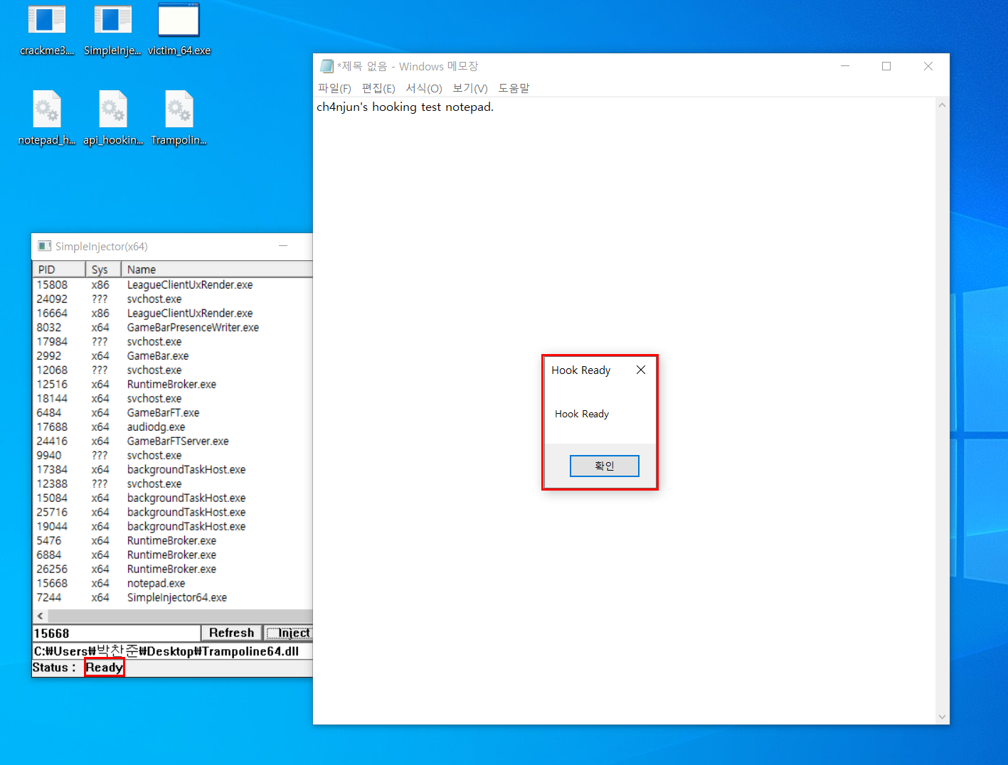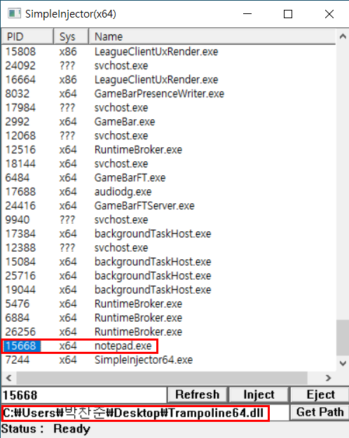 notepad.exe 를 킨후 위 코드로 생성한 dll 파일인 Trampoline64.dll을 Injection한다. 여기서 Injection할 때 나는 RtlCreateUserThread API를 사용한 SimpleInjector.exe를 사용했지만 다른 방법을 사용해도 상관없다.