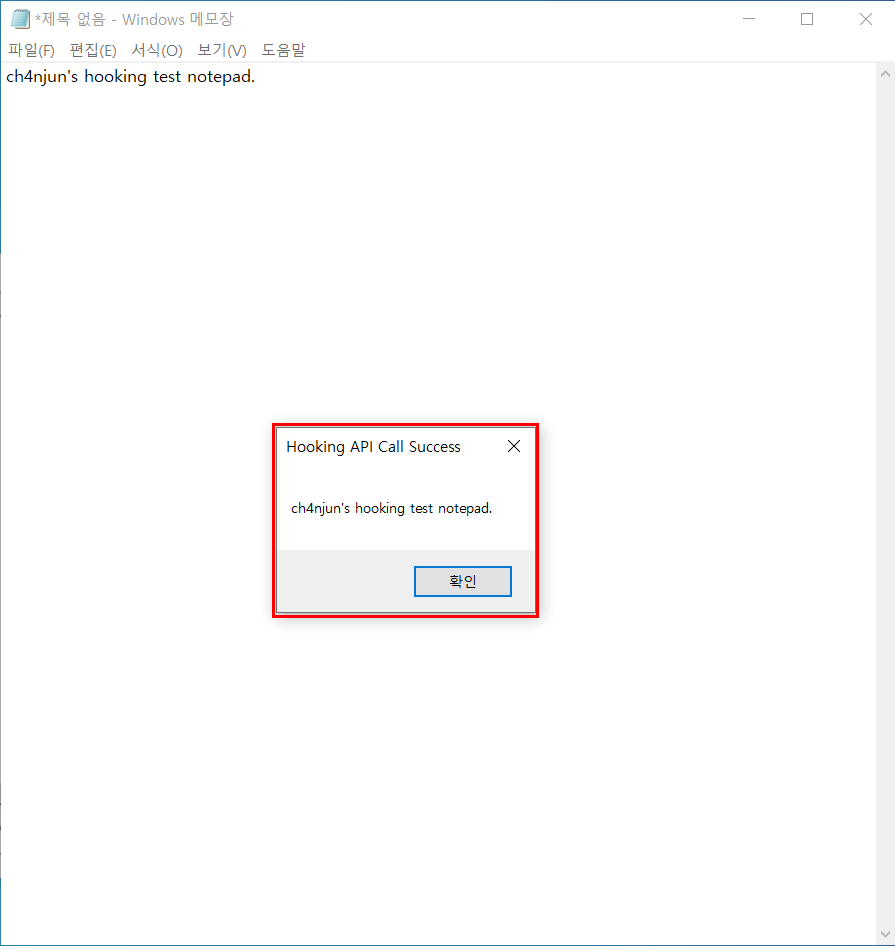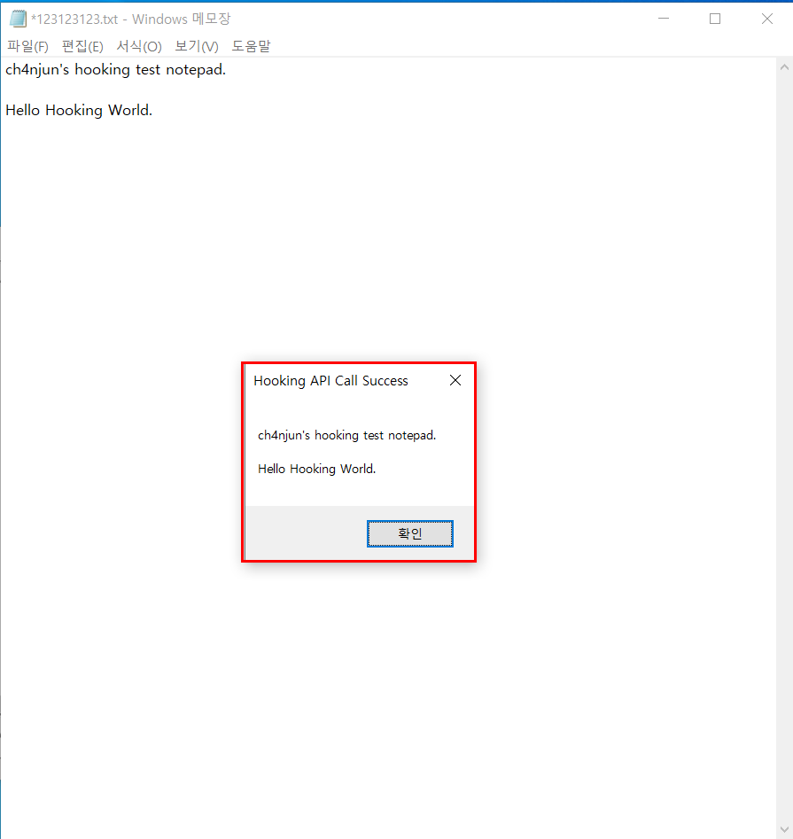 그러면 위와같이 DLL Injection이 성공했음을 알리는 MessageBox가 뜬것을 확인할 수 있다. 이제 대상 API가 정상적으로 Hooking 되었는지 파일을 저장해 확인해 보자.
