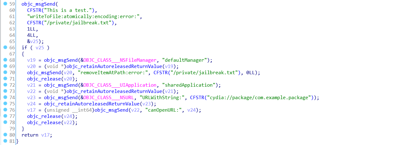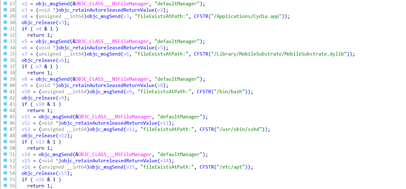 이후에 "This is a test.".writeToFile("/private/jailbreak.txt", 1, 4, &25) 를 통해서 해당 경로에 이 문자열을 쓰게 된다. /private는 시스템 레벨의 디렉토리며 여기에 접근하기 위해서는 root 권한이 필요하다. 정상적으로 작성이 되었다는 것은 탈옥이 되어 있는 디바이스라는 뜻이기 때문에 0x01을 반환하고 모두 해당되지 않는다면 0x00을 반환한다.