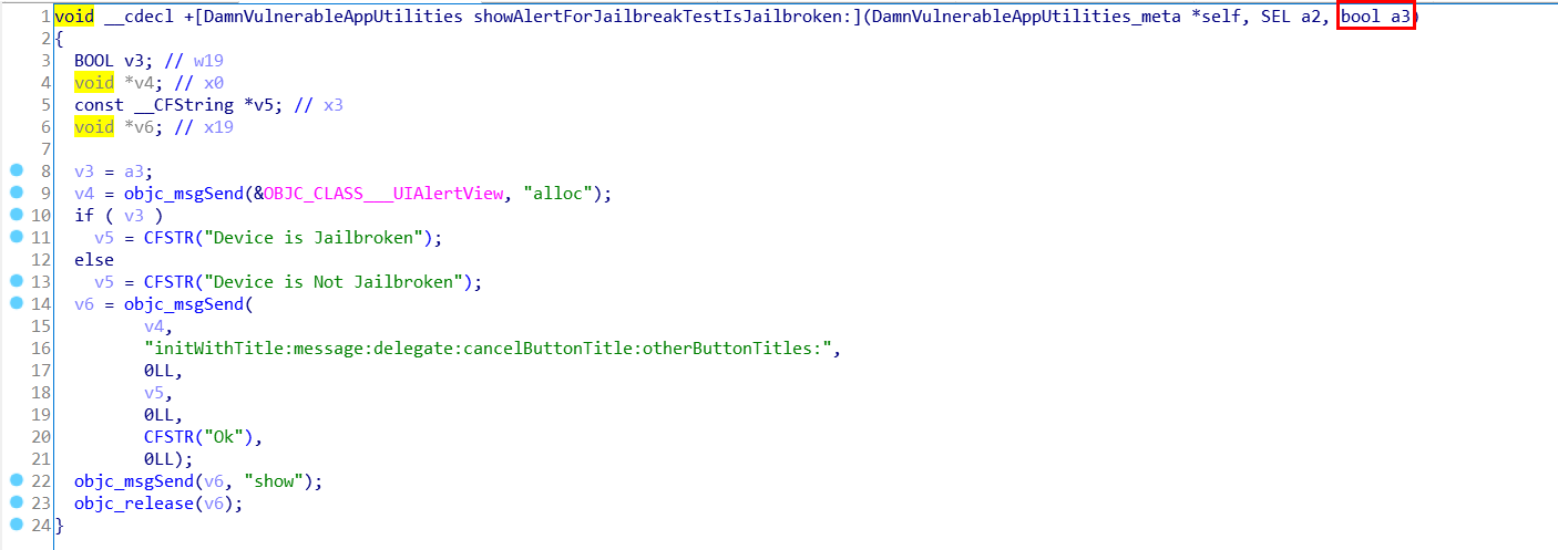 우선 해당 함수를 살펴보면 bool a3 라는 한 개의 파라미터를 통해 함수를 호출하게 된다. 따라서 위 Frida 코드의 onEnter 부분을 통해 파라미터를 항상 0x00으로 변경하게 된다면 항상 "Device is Not Jailbroken"을 보여주게 될 것이다.