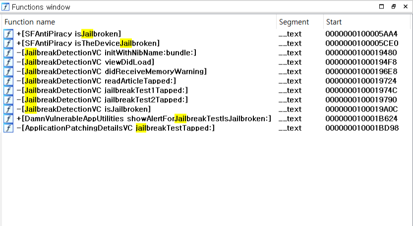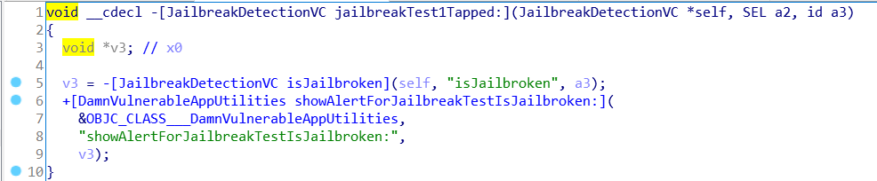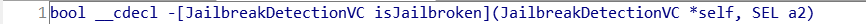 jailbreakTest1Tapped: 함수를 보면 내부에서 isJailbroken함수를 호출하고, 그 반환 값을 showAlertForJailbreakTestIsJailbroken: 함수에게 전달한다는 것을 확인할 수 있다.