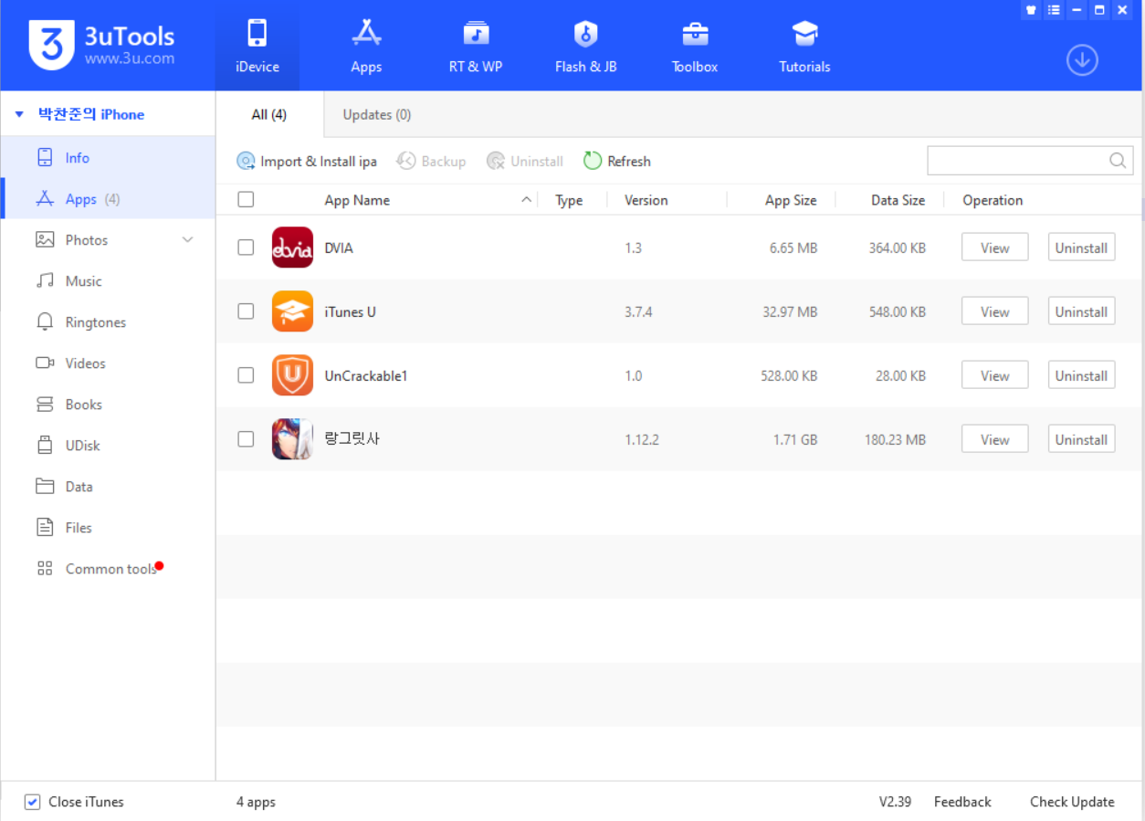 3uTools를 사용해 해당 IPA를 iphone에 설치한다.