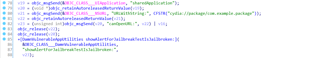 추가로 이런 방식을 통해서도 탈옥탐지를 진행한다. 결과적으로 Test 1, Test 2 모두 DamnVulnerableAppUtilities 클래스에 존재하는 + showAlertForJailbreakTestIsJailbroken: 함수를 통해 결과를 판단한다.