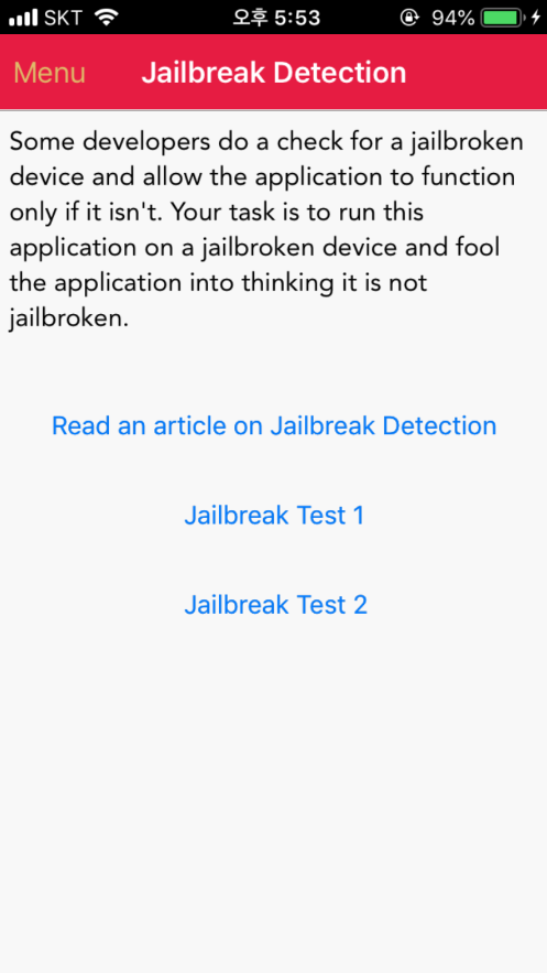 앱을 켜보면 이와같이 Jailbreak를 탐지할 수 있는 항목을 확인할 수 있다. Test 1, Test 2 를 누르면 탈옥됐다는 메세지가 뜬다. 이를 우회하는 것을 시도해 보는 과정을 보여준다.