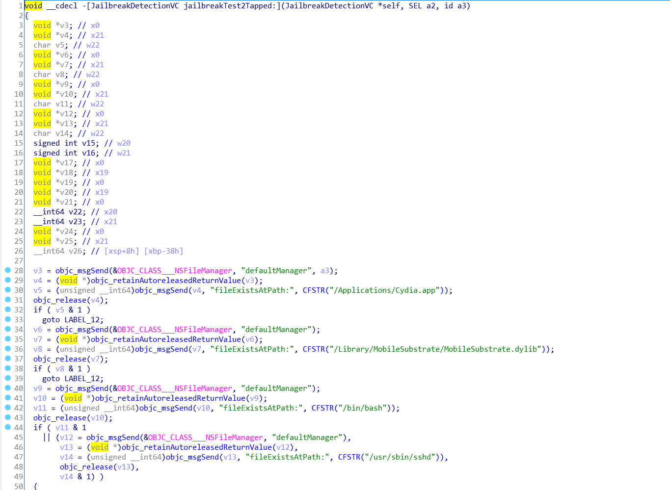 해당 함수를 살펴보면 - isJailbroken 함수의 내용이 직접 구현되어 있는 것을 확인할 수 있다. 그리고 추가로