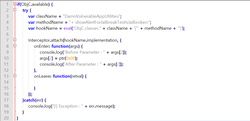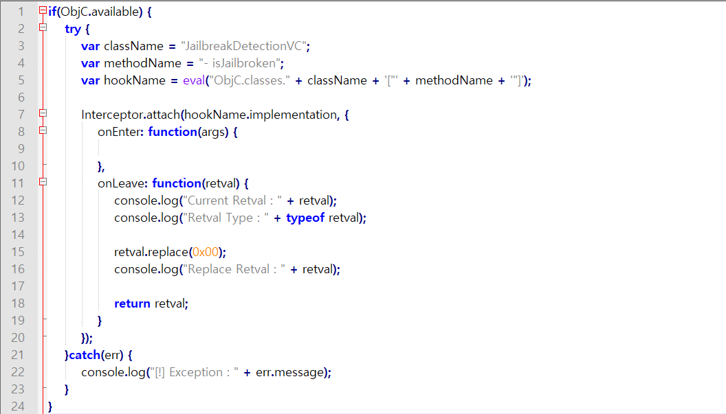 이제 - isJailbroken 함수의 반환값을 무조건 0x00으로 하도록 Hooking하는 코드를 짜본다.
