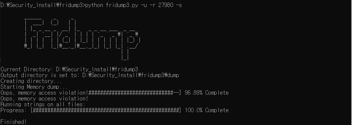 Python2가 설치된 환경에서는 Fridump, Python3가 설치된 환경에서는 Fridump3를 사용하면 된다.