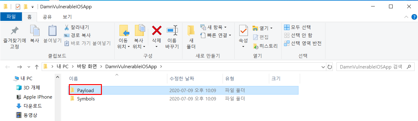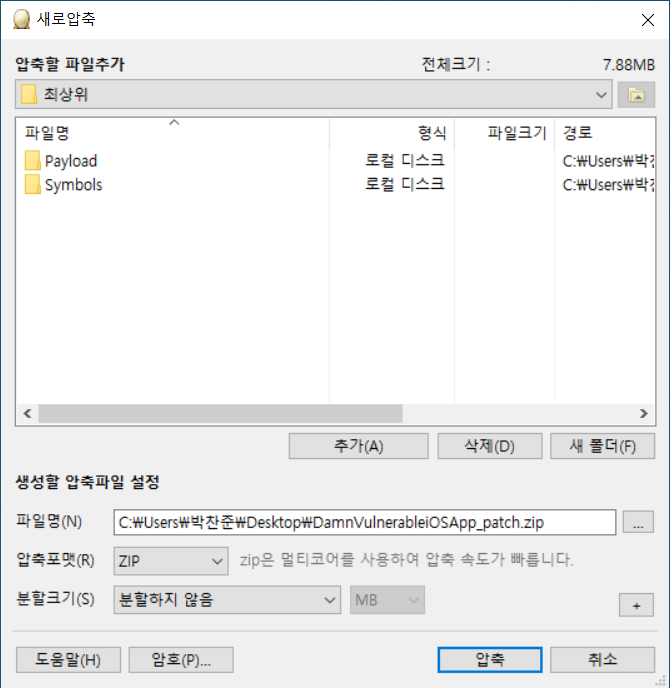 9. 추출한 Binary File을 기존 IPA 폴더에 덮어쓰고 압축후 확장자를 .ipa로 변경한다.