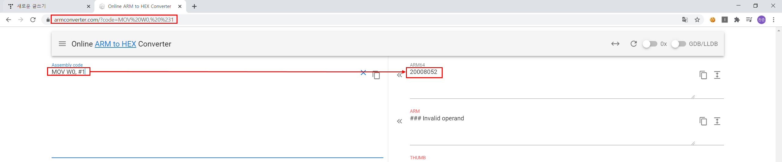 에서 ARM 명령어를 HEX값으로 바꿀 수 있다.