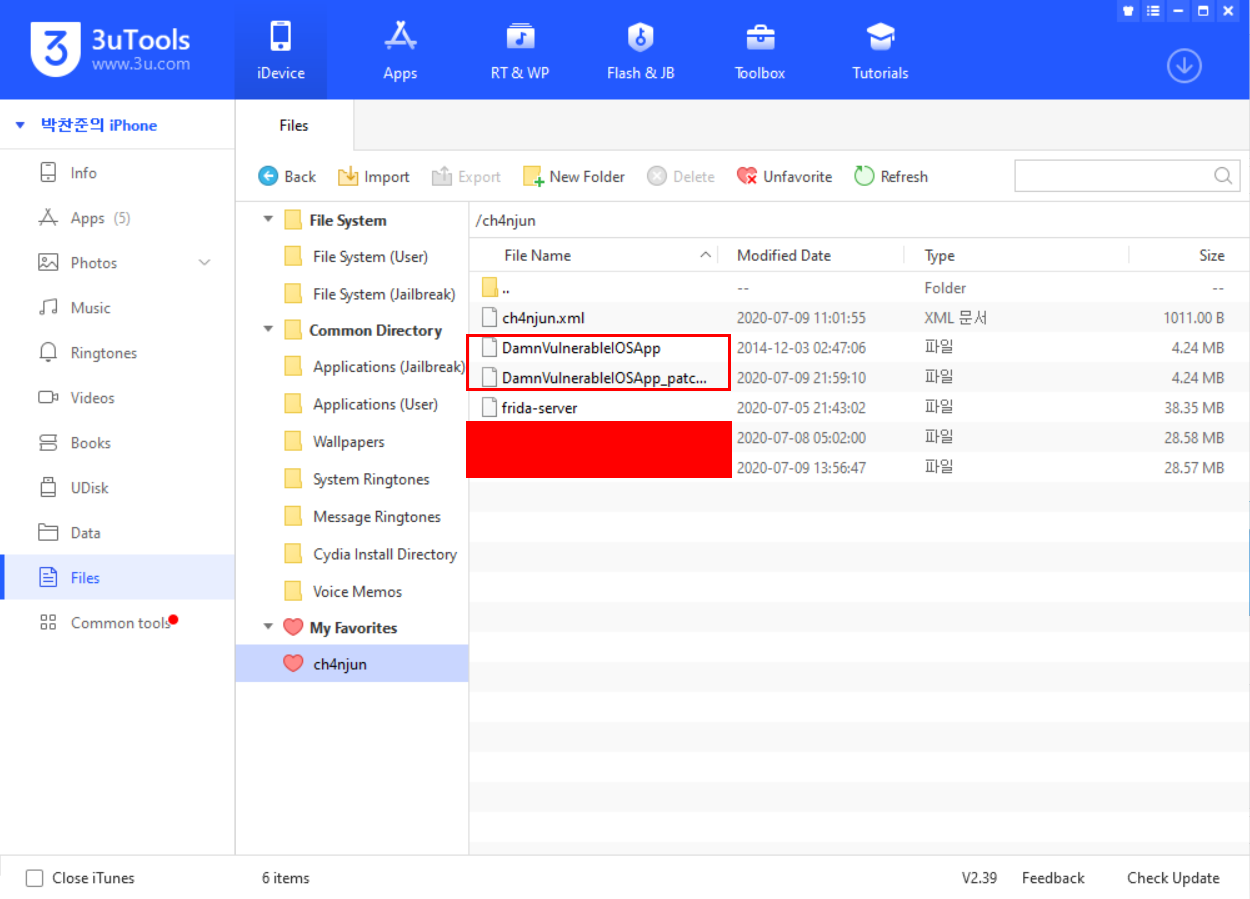 6. 3uTools로 원본 Binary File과 수정한 Binary File을 iphone에 넣는다.