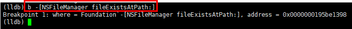 "b -[NSFileManager fileExistsAtPath]" 명령어를 사용해 BreakPoint를 설정한다.
