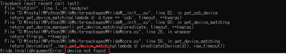 이와 같은 에러가 실행할 때마다 뜨는데 이게 뜨고 바로 실행되기 때문에 신경쓰지 않아도 된다. 그러나 아래와 같이 device not found 에러가 발생하면 FRIDA가 Device를 제대로 인식하지 못하는 것이기 때문에 Terminal에서 Python에 접속해 "import frida; frida.get_usb_device()" 가 성공적으로 동작할 때까지 실행시킨 후 대기시키도록 한다.