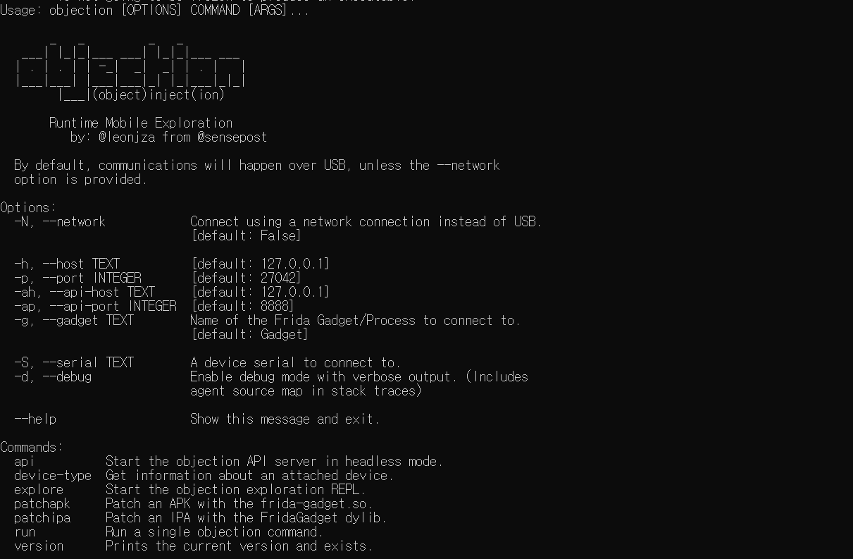 objection는 기본적으로 USB를 사용해 연결된 Device를 통해 사용되기 때문에 별다른 옵션이 필요없다. 기본적으로 objection은 spawn을 통해서만 Application에 Attach하게 된다. (무조건 처음부터 App이 다시 실행된다.)