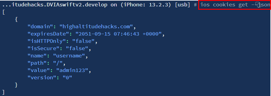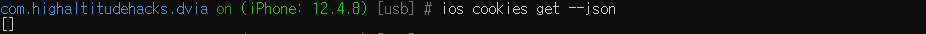 "ios cookies get --json" 명령어를 사용해 Binary Cookie에 저장된 데이터를 확인할 수 있다.