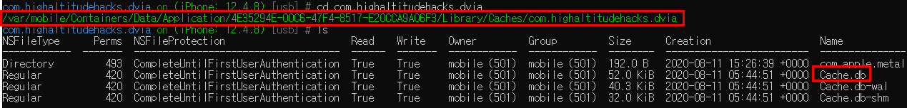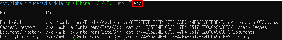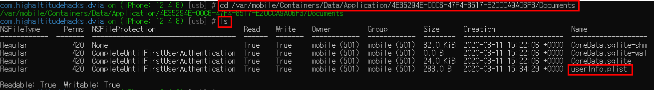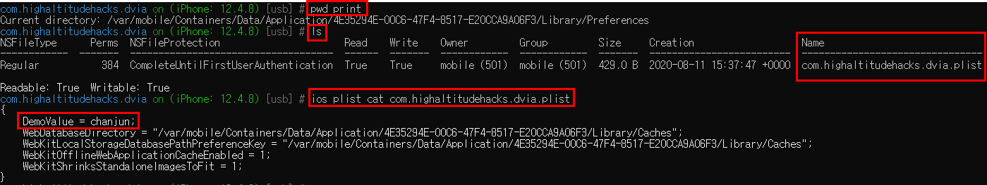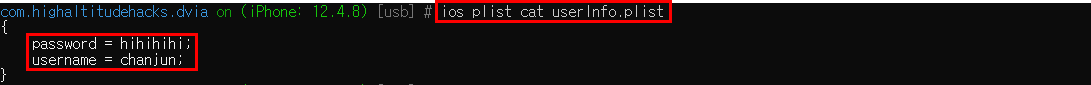 Library밑에 위치한 Preferences 디렉토리에 PACKAGE이름과 동일한 plist파일에 해당 데이터가 존재하는 것을 확인할 수 있다. 명령어는 위에서 사용한 것과 동일하게 "ios plist cat com.highaltitudehacks.dvia.plist"를 사용했다.