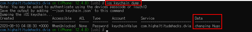 "ios keychain dump" 명령어를 사용해 Keychain에 저장된 데이터를 확인할 수 있다.