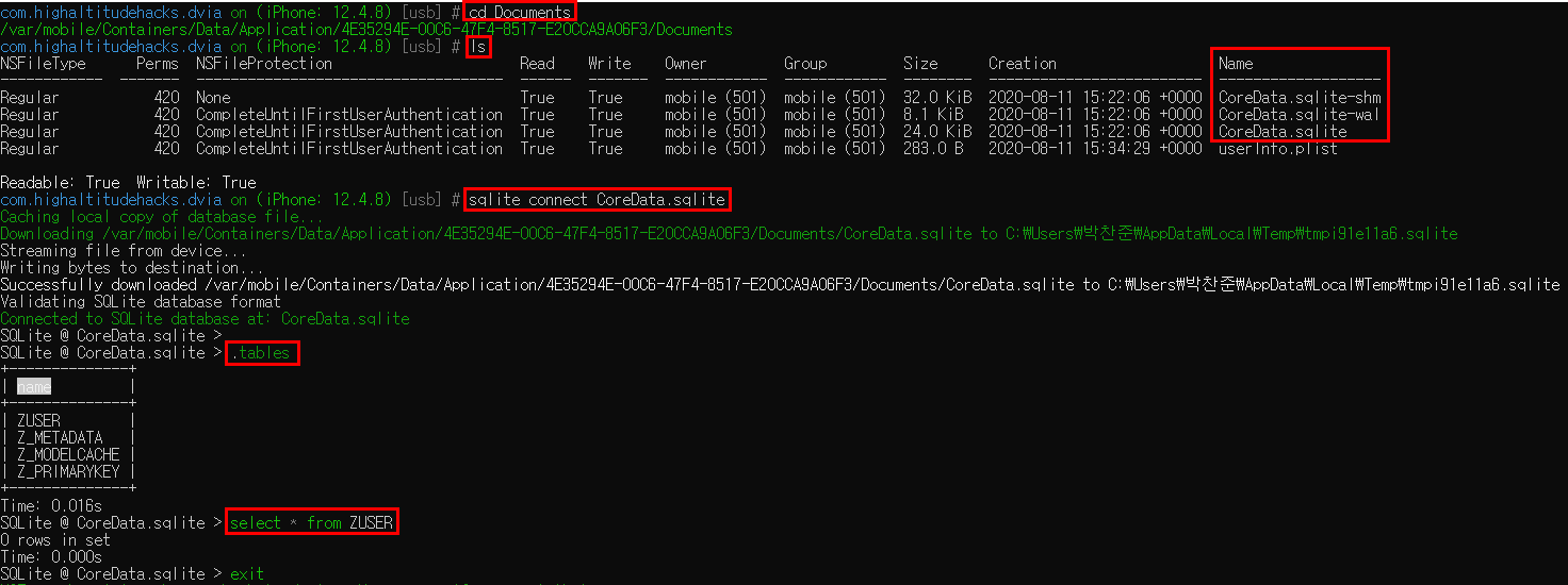 이렇게 "sqlite connect CoreDAta.sqlite" 명령어를 사용해서 해당 Database에 연결할 수 있다.