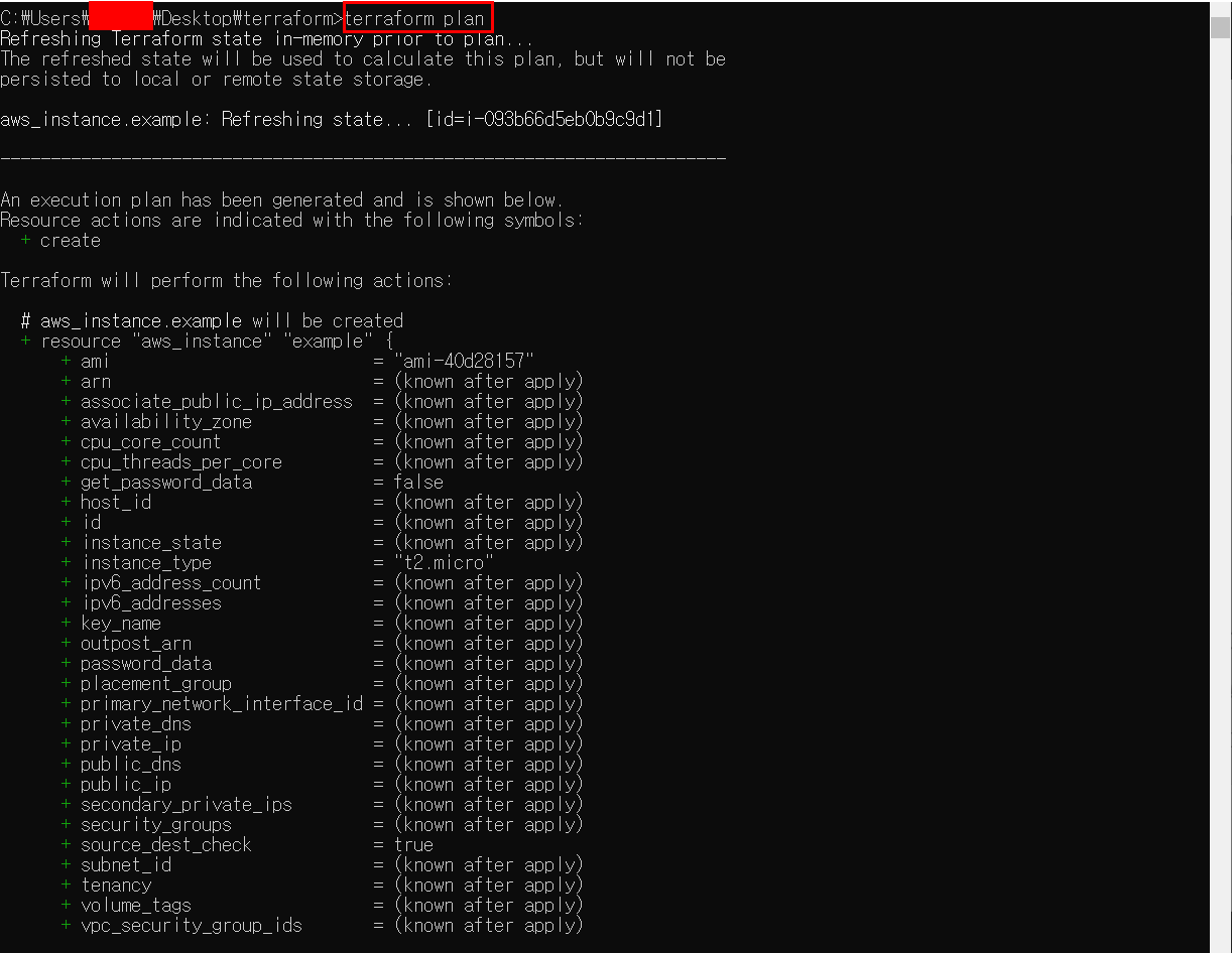 그리고 이어서 "terraform plan" 명령어를 수행하게 되면 apply를 했을 때 어떻게 진행될지에 대한 정보를 확인할 수 있다.