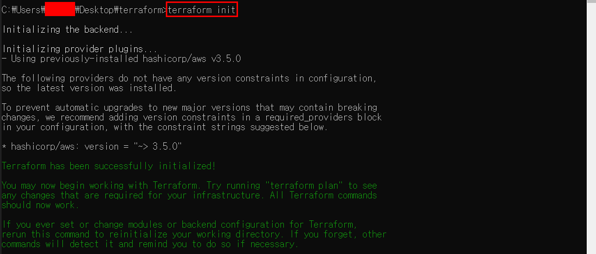 베이스 디렉토리로 사용할 곳으로 이동해서 CMD에서 "terraform init" 명령어를 수행한다.