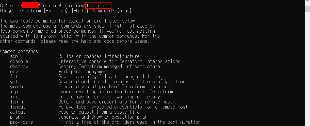 압축을 해제하면 실행파일 하나만 덩그러니 나타나며, 환경변수 설정을 통해 CMD 창에서 편리하게 사용할 수 있도록 설정했다. CMD 창에서 terraform 명령어를 입력해서 Usage가 뜨면 정상적인거다.