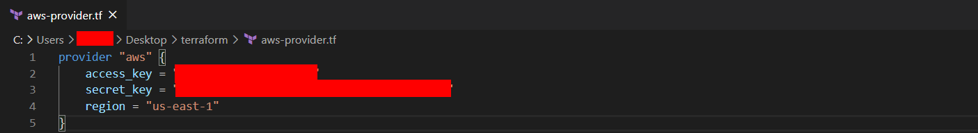 1번에서 획득한 Access key와 Secret key에 대한 정보를 aws-provider.tf 파일을 생성해 저장한다.
